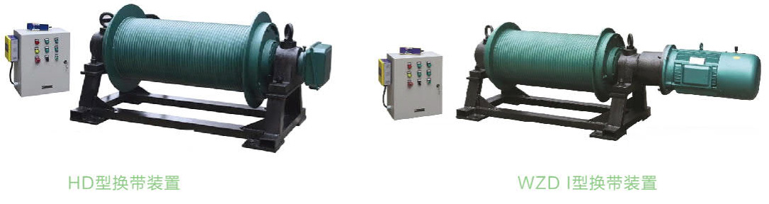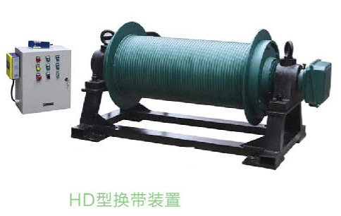 换带装置由:胶带夹具、钢丝绳(根据现场需要选择长度和直径)、卷扬滚筒、滚筒支架和控制系统组成;卷扬滚筒部分参照JB/T 7330-2008《电动滚筒》设计制造的:本装置集机电为一体,高效、安全和可靠。同时具有以下特点·-对于有角度的胶带输送机在安装胶带时,为防止使用过程中突然停电或断电,胶带的重力导致胶带下滑,我们配置了连锁自动保护装置,确保胶带的安装和更换过程中的安全、可靠:本装置使用过程中胶带左右摆动幅度不大于5%。
