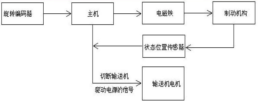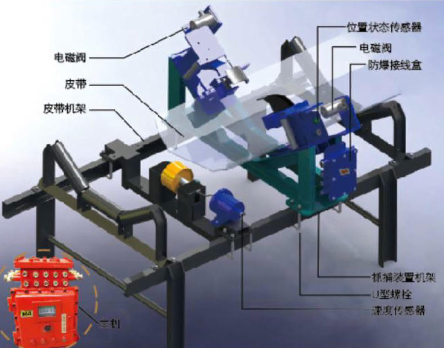 带式输送机用断带抓捕装置工作原理,如图,传感器采集输送带的运行参数并转化成电信号,主机进行数据处理后发出相应指令,当传感器检测到皮带速度异常(反转或超速)超出设定值时,主机发出抓捕指令,多台断带抓捕器的电磁阀同步动作,抓捕机构制动住失速的皮带,防止事故的扩大;同时切断皮带输送机控制回路电机电源。状态位置传感器检测抓捕装置闸臂动作并发出报警信号。