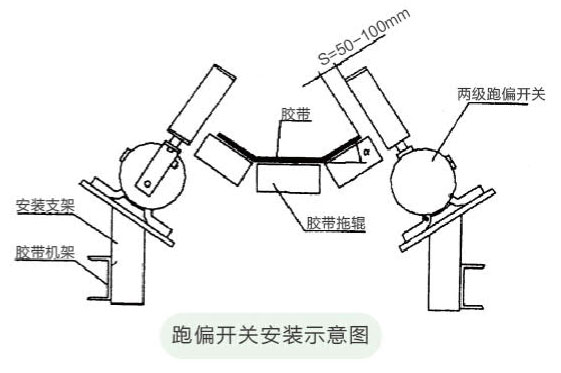 该装置用于检测胶带的跑偏量,是实现胶带机控制的自动报警和停机的保护装置。