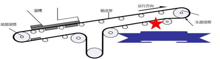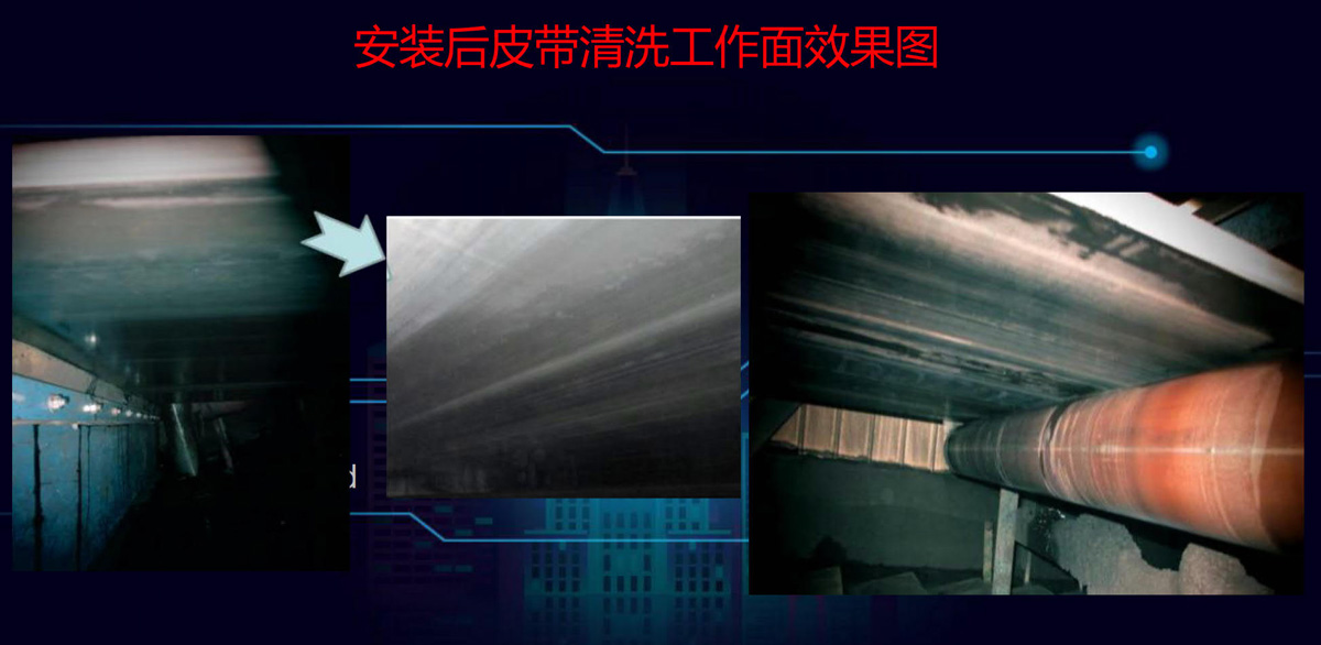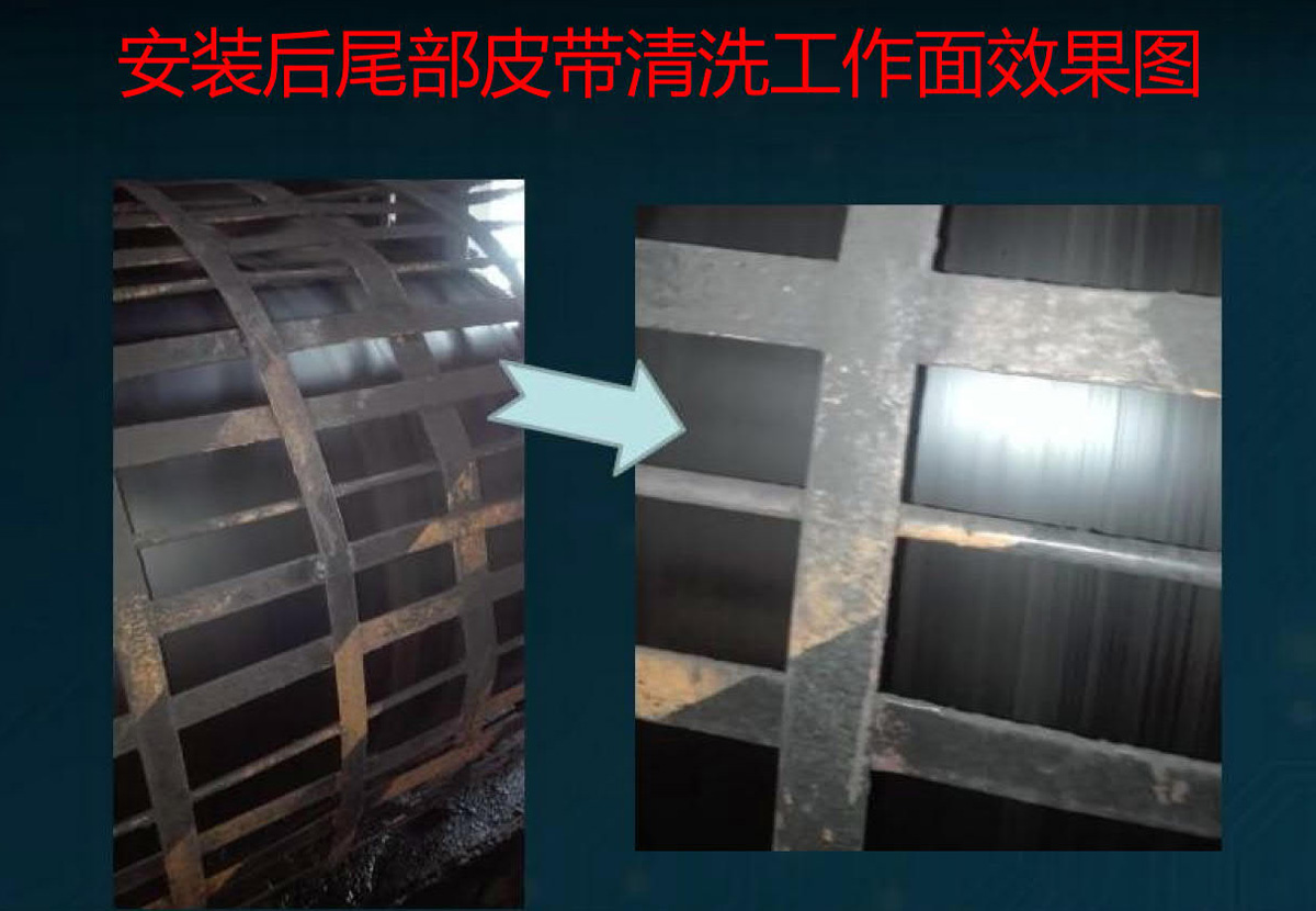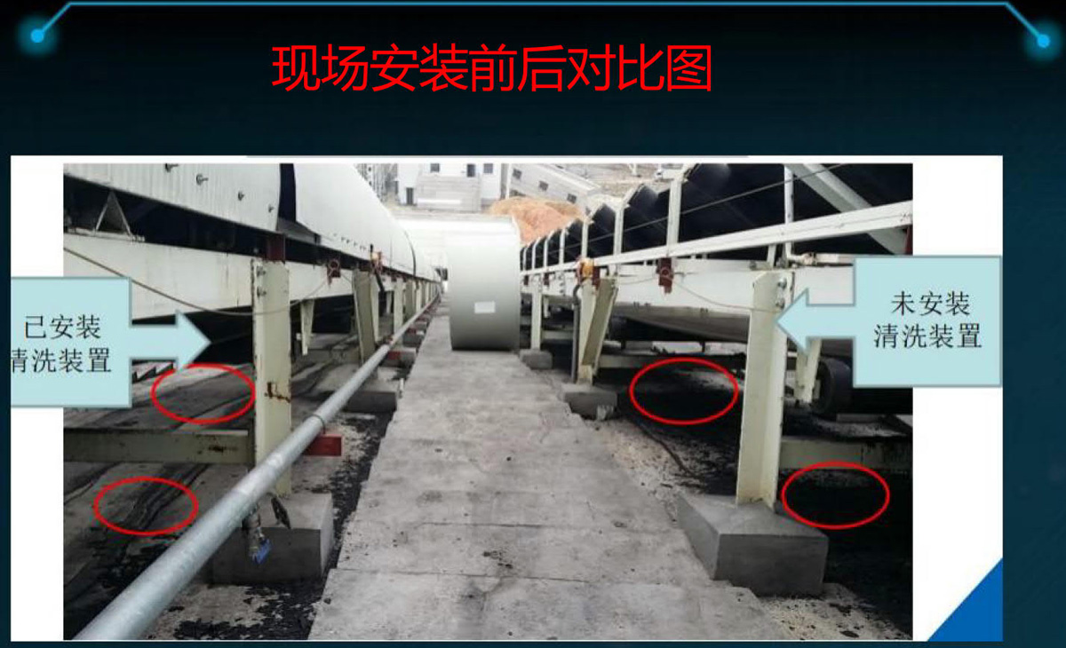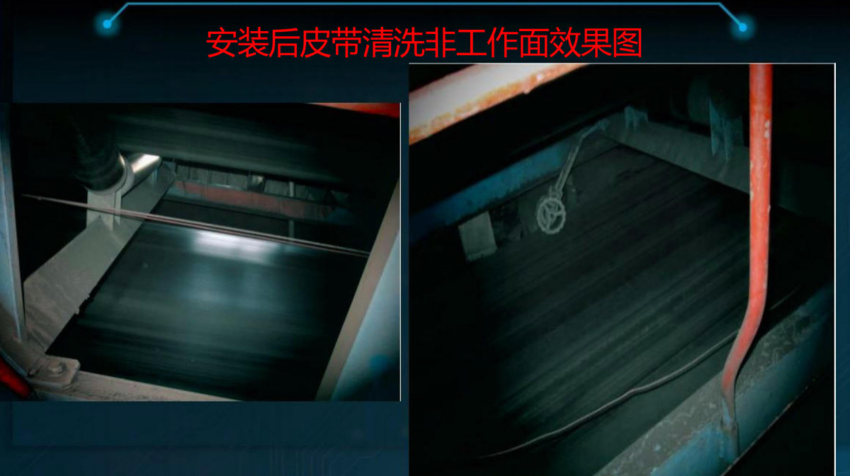 清洗机安装在回程皮带下面,靠近皮带机卸载辊筒处