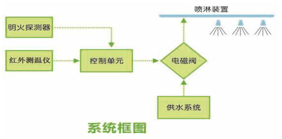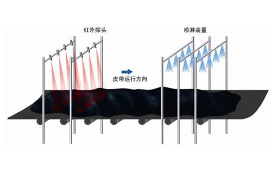红外测温仪测量输煤皮带上煤炭的实时温度,将数据传送至控制单元,控制单元根据分析数据研判当前煤炭温度是否发生异常,如发生异常,由控制单元发出指令使电磁阀动作,同时与控制输煤皮带速度的变频模块进行连锁,将输煤皮带速度降低到当前速度的二分之一,消防水通过电磁阀控制由喷淋头喷出,以达到扑灭明火或降低煤炭温度的目的,随后输煤皮带恢复正常速度运行。