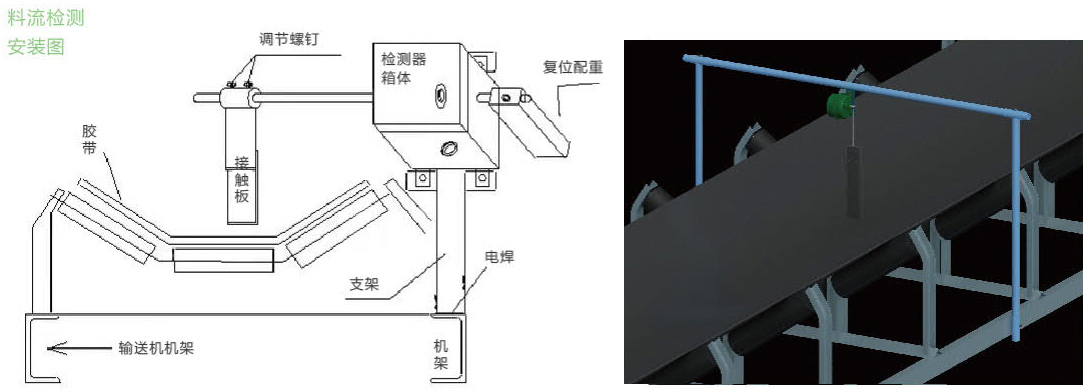 料流检测器是作为胶带运输机运送物料时做检测物料瞬时状态的一种检测装置,也可以与洒水装置配套使用,实现有料时的自动洒水功能。