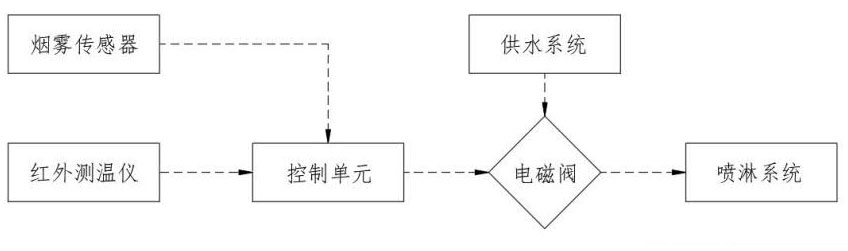 红外测温仪测量输煤皮带上煤炭的实时温度,将数据传送至控制单元,控制单元根据分析数据研判当前煤炭温度是否发生异常,如发生异常,控制单元将报警信号发送至输煤程控系统,同时发出指令使电磁阀动作,消防水通过电磁阀控制由喷淋头喷出,以达到扑灭明火或降低煤炭温度的目的。